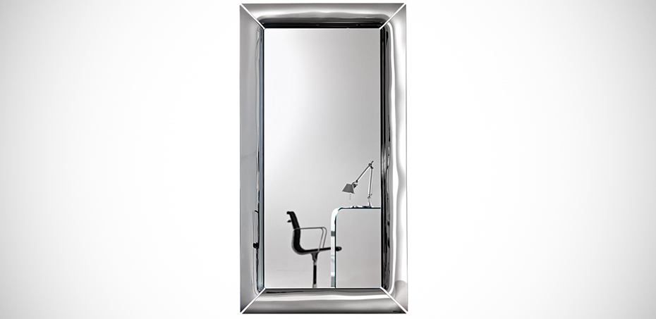 Caadre free-standing mirror by Fiam available in hanging version, in 6 mm-thick curved glass. Available in 4 different versions: (neutral version), with engravings (engraved version), in corrugated curved glass and back-silvered 6 mm-thick (plissé version), or semi-reflective glass titanium finishing 6 mm-thick (titanium version). Metal grey-stained frame (G02).