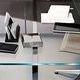Desk in 12mm transparent tempered glass. Available also with painted glass top as per samples in the bright or satin version. Bright or satin stainless steel, anodised aluminium or embossed white or black lacquered metal parts. For a proper cable management, a hole on the top, can be arranged upon request. Minimum distance from the edge: 10cm.