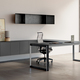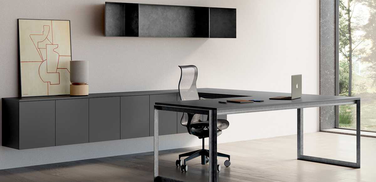 Elegant executive composition with desk, side extension and anthracite suspended container. Frame in iron as the wall unit. The original "L" profiles combination of the iron frame creates a game of volumes, a solids and voids’ alternation of an unprecedented design.